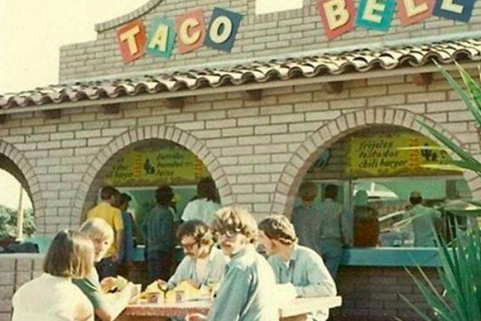 The first Taco Bell was an outdoor hangout. It had a walk-up window and no indoor seating. Instead, people could sit effectually burn pits on the patio and listen to live mariachi bands.