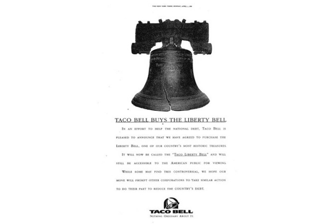April Fools! As a marketing ploy, Taco Bong launched a full-page print advertising announcing it was purchasing the Freedom Bell. The advertisement was published in The Philadelphia Inquirer, New York Times, Washington Mail, Chicago Tribune, Dallas Morning News and United states Today on April 1, 1996.