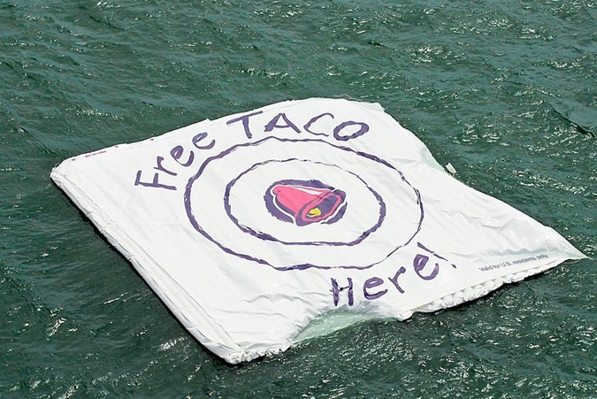 In 2001, when Russia'southward Mir Space Station deorbited and headed to crash in the southern Pacific Ocean, Taco Bong ready a floating target. The target read: "Complimentary taco here!" If even a fragment of the station landed on the target, Taco Bell promised every person in the U.S. ane free taco.